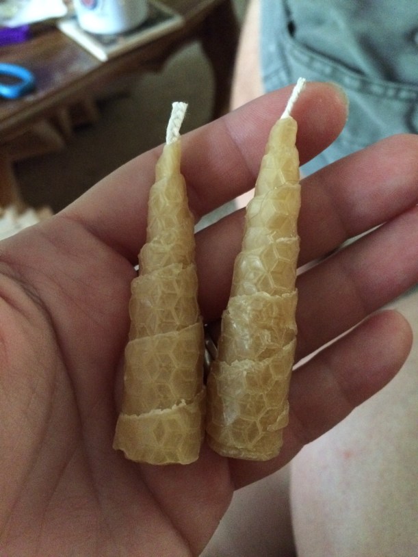 We ordered foundation for the beehive frames. Basically, it’s sheets of beeswax that help the bees build up their stores more quickly. A few of them got messed up in the installation. Not wanting to let the wax go to waste, I stripped out the wires and made some candles.