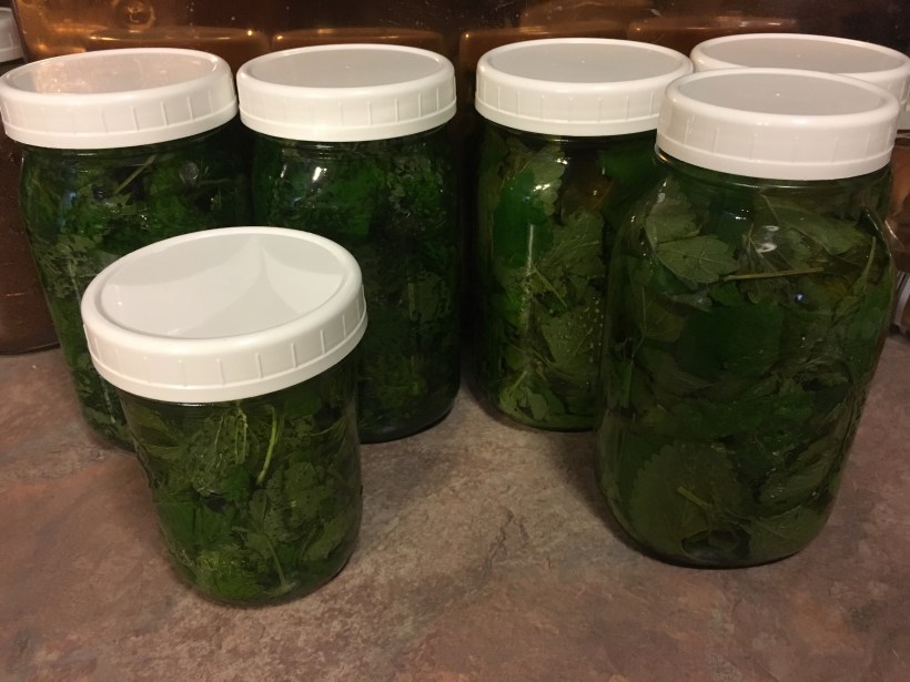 My lemon balm was overtaking the herb garden. I had no idea what to do with the stuff, other than walking by and pinching a leaf to smell. I turned to Pinterest for ideas and decided I would use my lemon balm to make infused oil and infused vinegar. The oil will be used later in products such as lip balm, salve and soap. The vinegar can be used in cooking, salad dressings or (most likely) as a conditioner for my hair (fragrance allergy, if you haven’t read past blog entries).