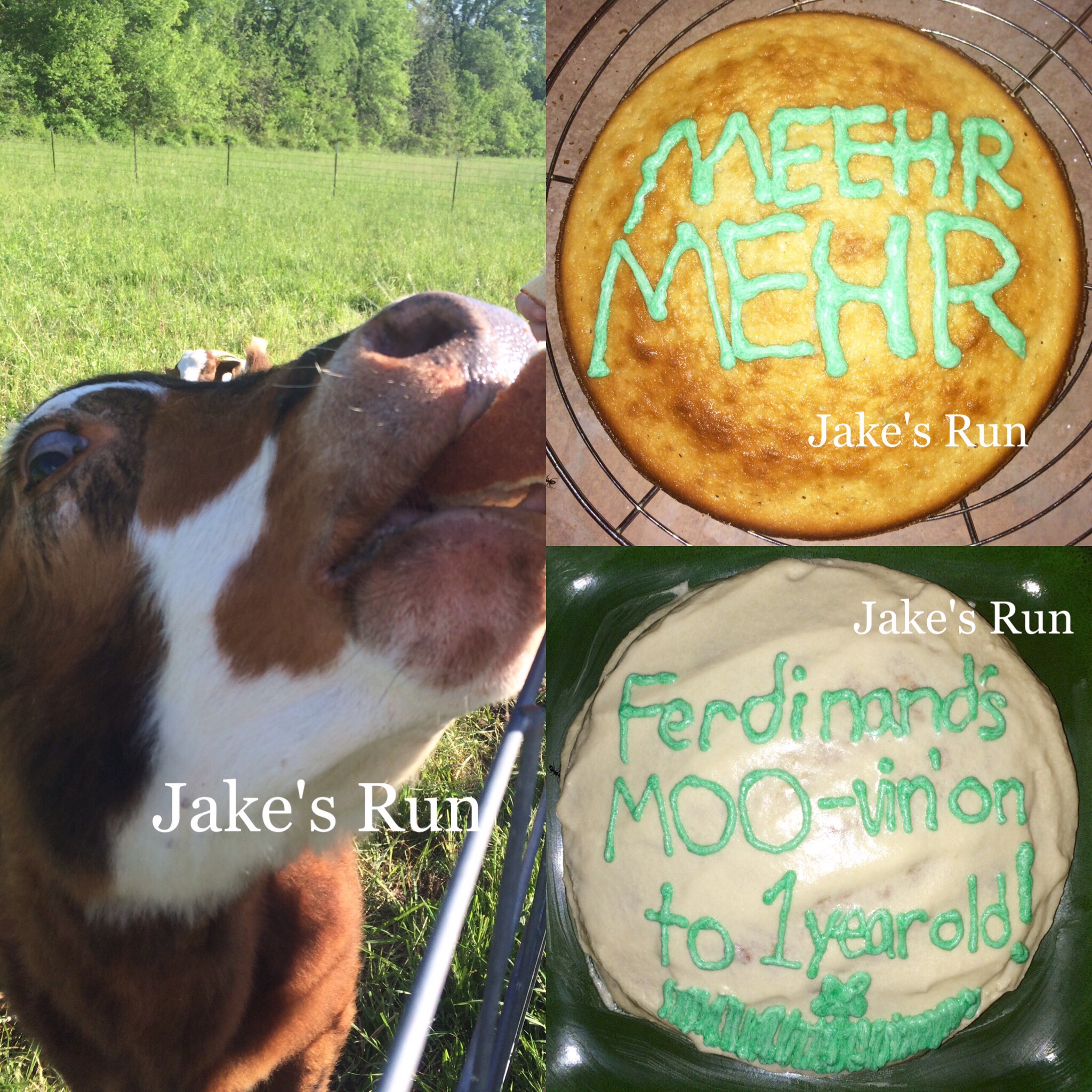 Additionally, yesterday was Ferdinand (AKA Cow)’s 1st birthday.  Of course, Farm Girl had to bake him a cake. Or two. One was for us, the other for him. She said she wrote “MEEHR” on the cake because that’s how he calls to us when we’re outside – as in “come MEEHR and feed me animal crackers!!”
